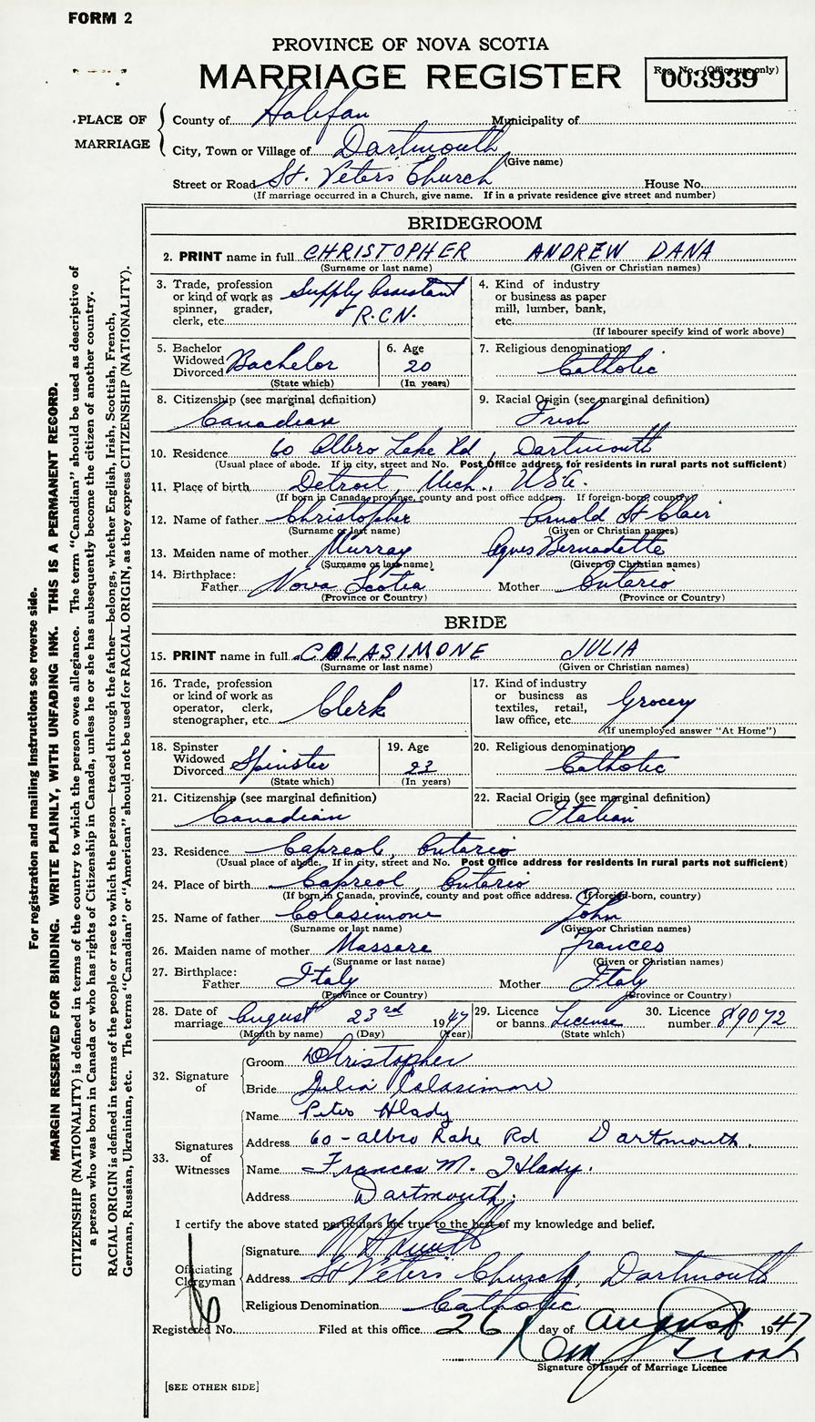 28. Date of marriage August 23 1947 29. By license or banns License 30. License number 89072