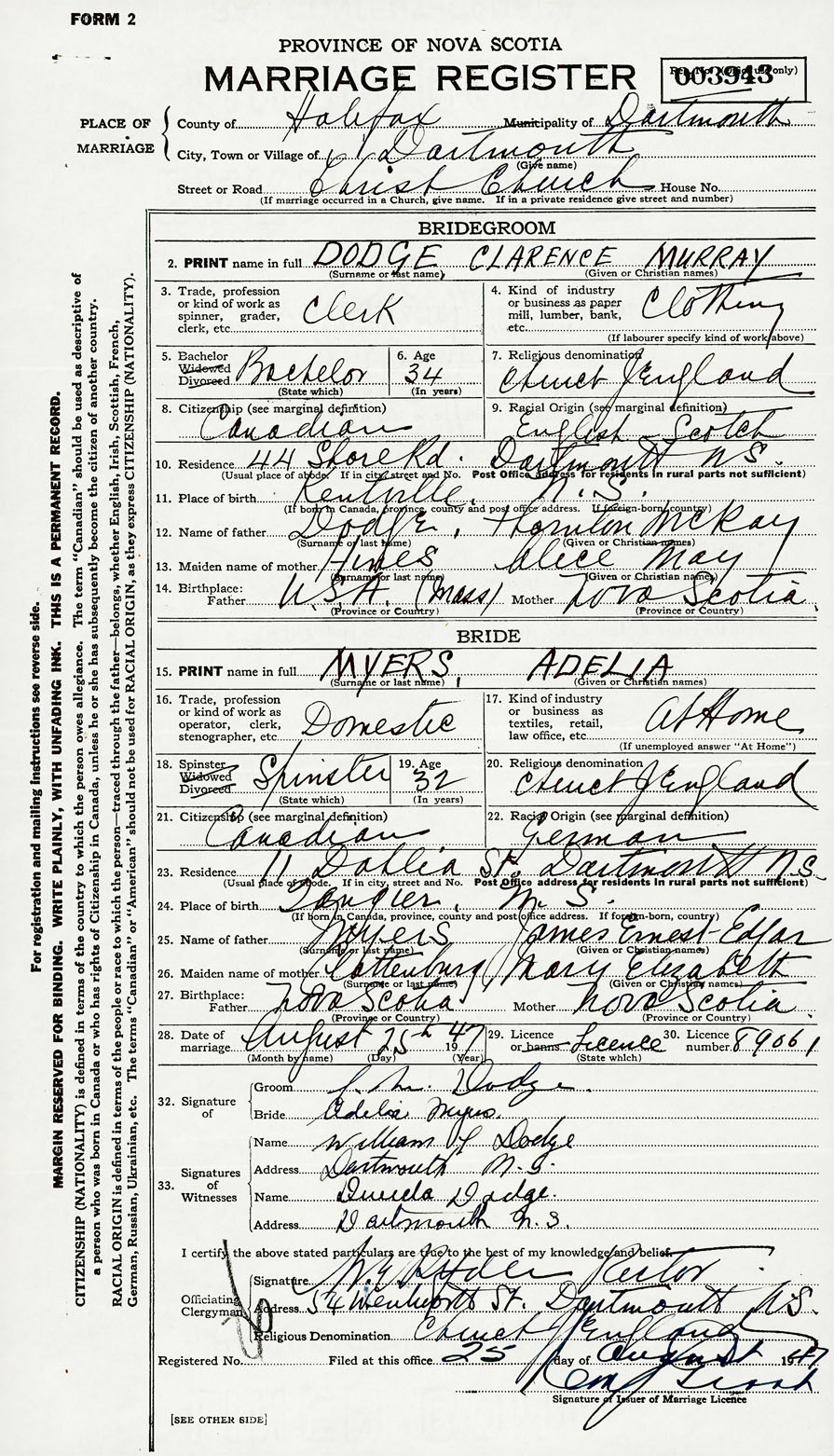 28. Date of marriage August 25 1947 29. By license or banns License 30. License number 89061