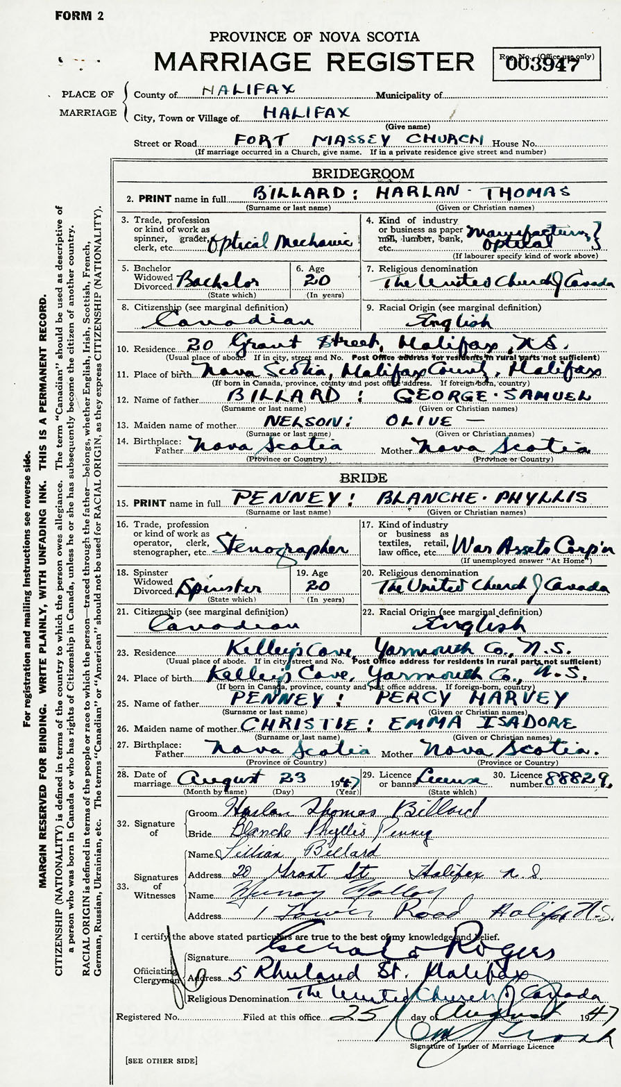 28. Date of marriage August 23 1947 29. By license or banns License 30. License number 88829