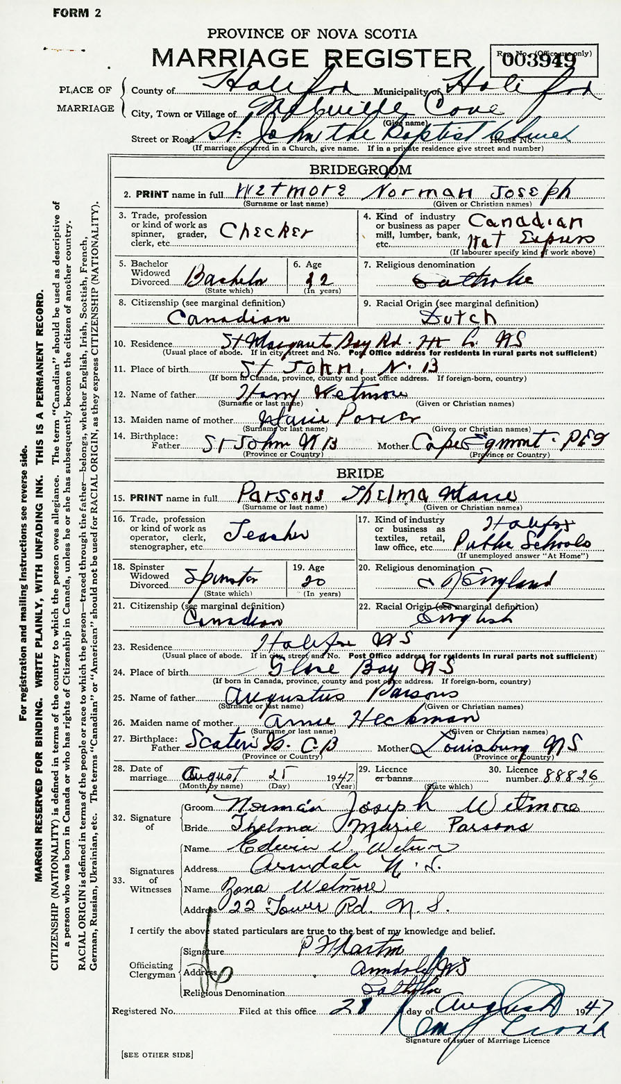 28. Date of marriage August 25 1947 29. By license or banns License 30. License number 88826
