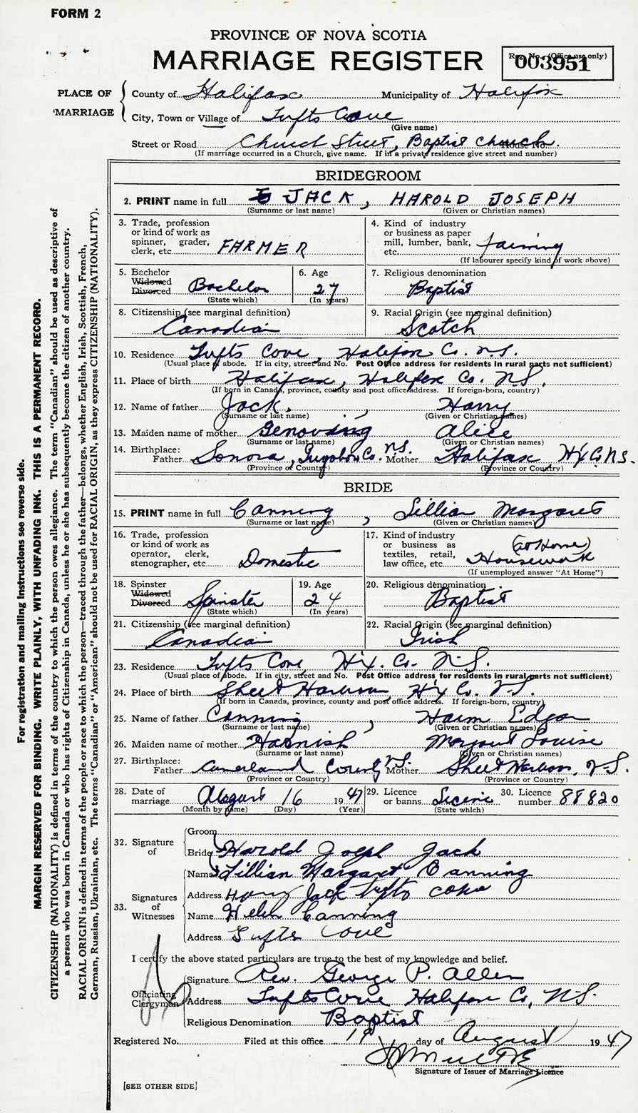 28. Date of marriage August 16 1947 29. By license or banns License 30. License number 88820
