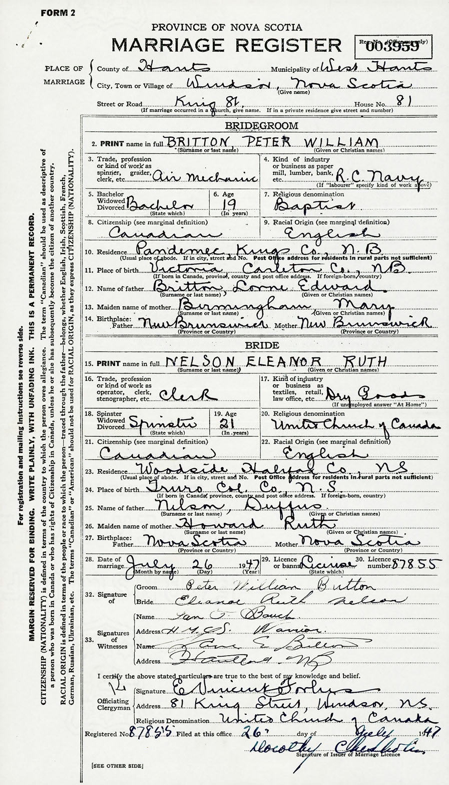 28. Date of marriage July 26 1947 29. By license or banns License 30. License number