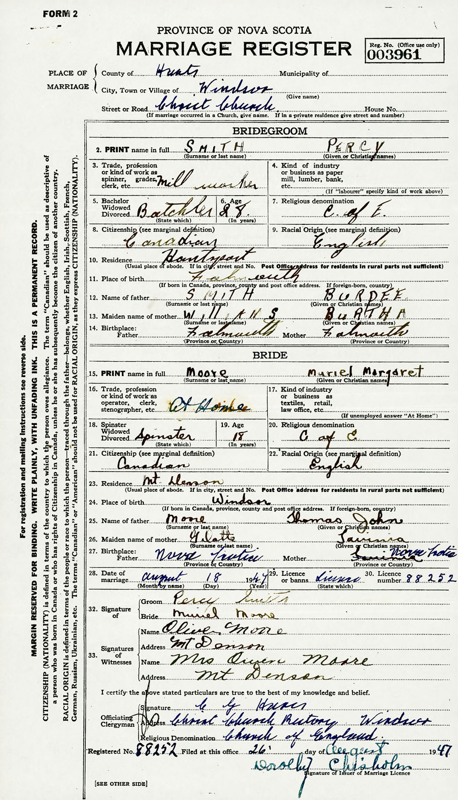 28. Date of marriage August 18 1947 29. By license or banns License 30. License number 88252