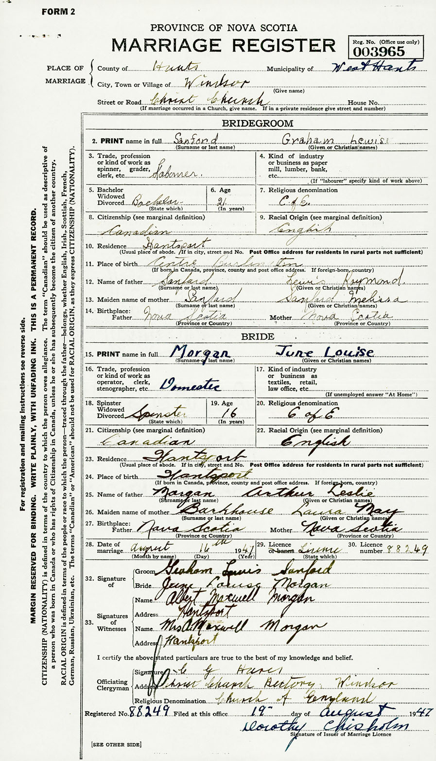 28. Date of marriage August 16 1947 29. By license or banns License 30. License number 88249