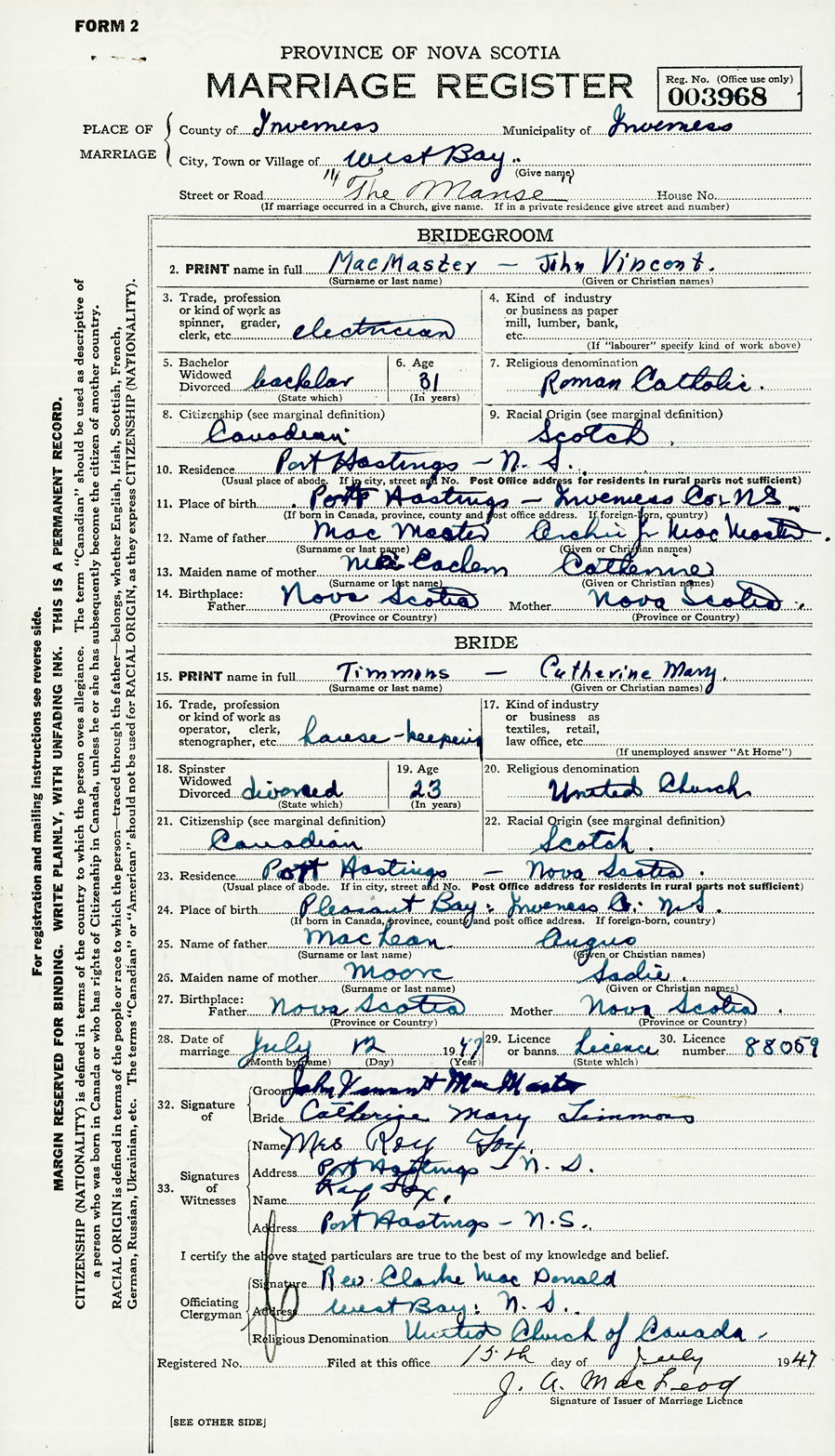 Groom John Vincent MacMaster