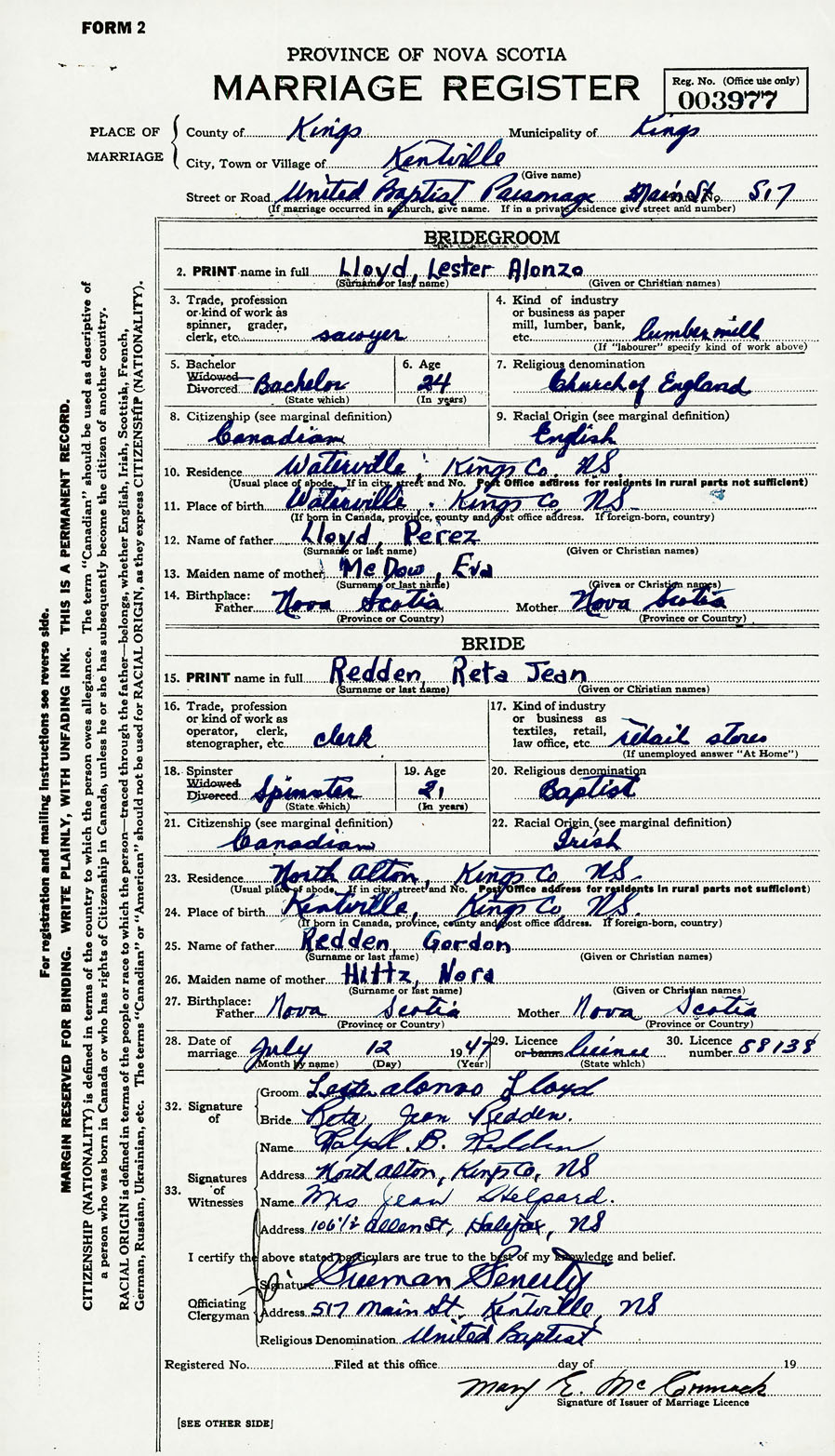 28. Date of marriage July 12 1947 29. By license or banns License 30. License number 88138