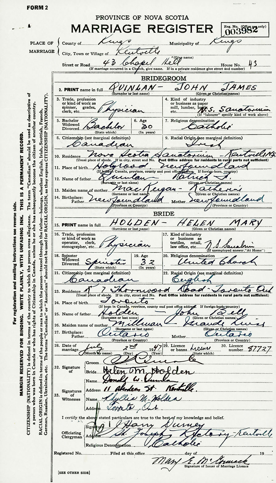 18. Spinster Widow or Divorced Spinster 19. Age 32 20. Religious denomination United Church of Canada