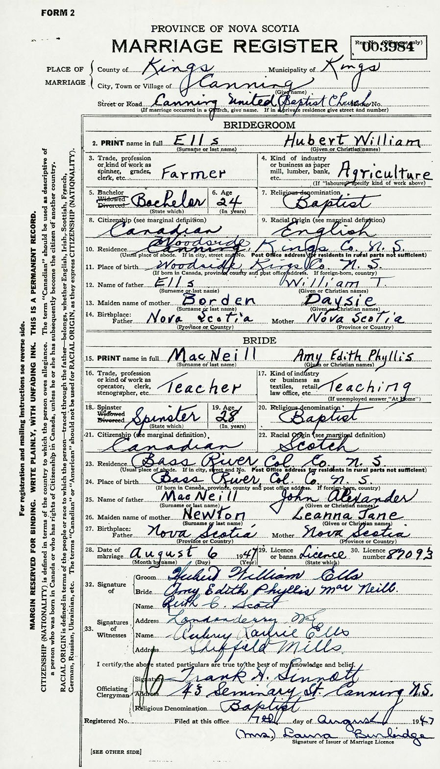 28. Date of marriage August 6 1947 29. By license or banns License 30. License number 87093
