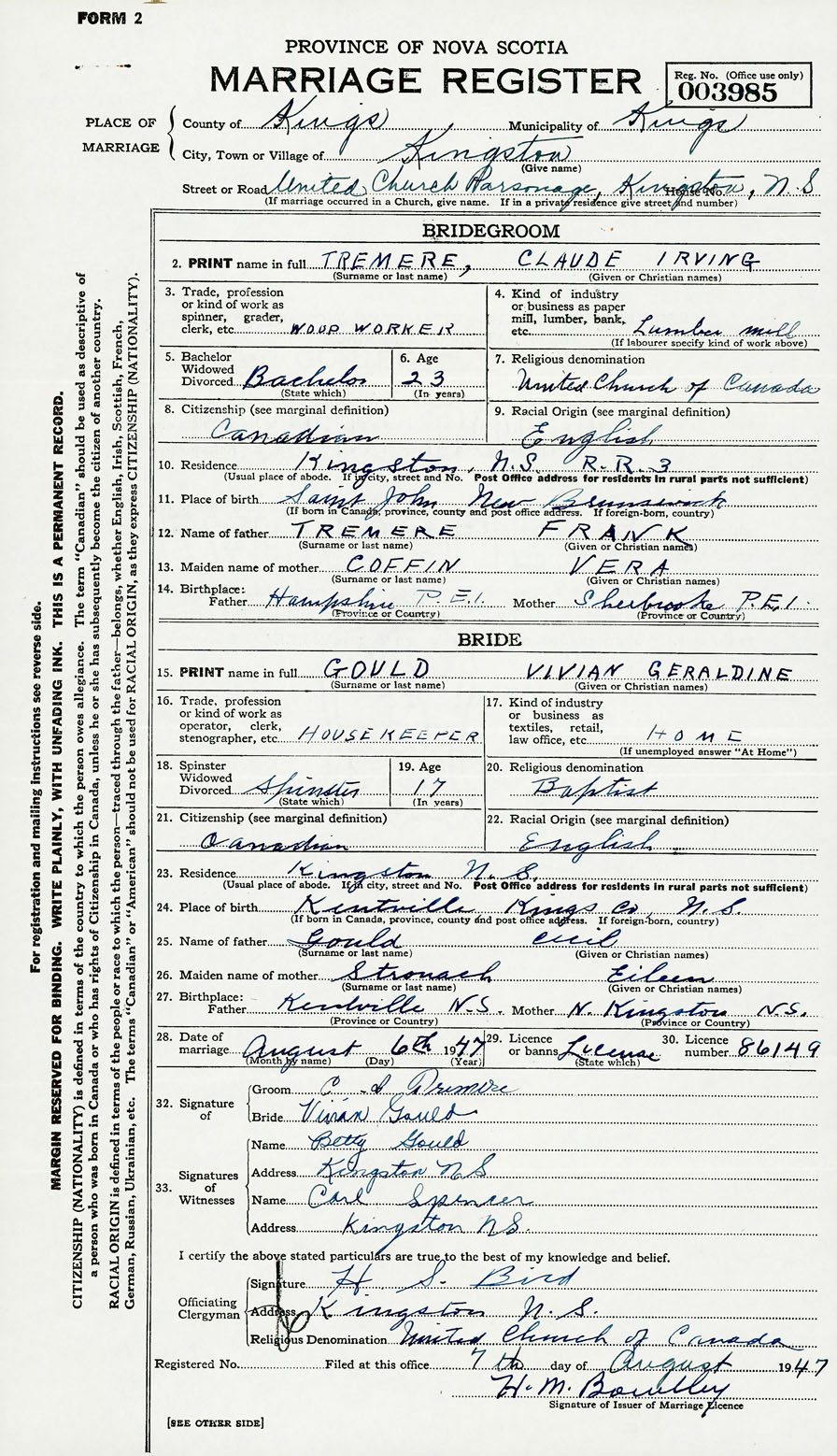 27. Birthplace Father Kentville Nova Scotia Mother N.Kingston, Nova Scotia