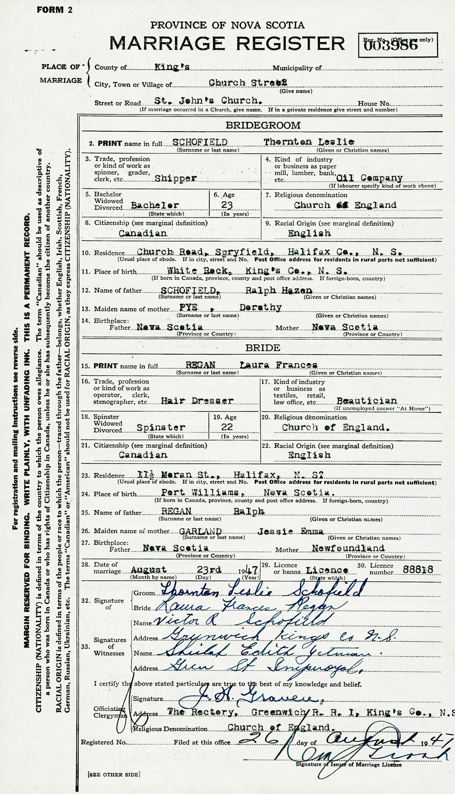 28. Date of marriage August 23 1947 29. By license or banns License 30. License number 88818