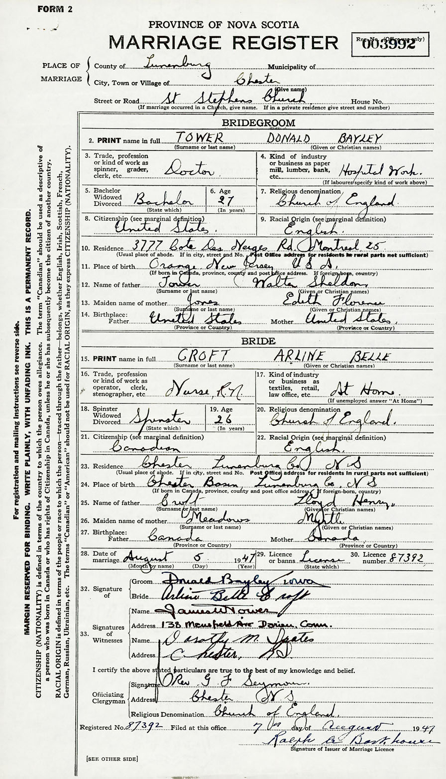 28. Date of marriage August 5 1947 29. By license or banns License 30. License number 87392