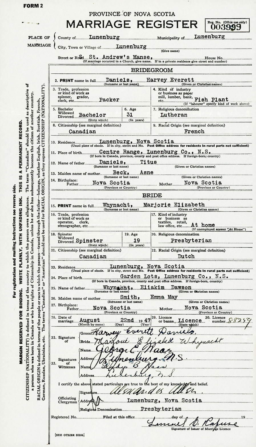 28. Date of marriage August 22 1947 29. By license or banns License 30. License number 88259
