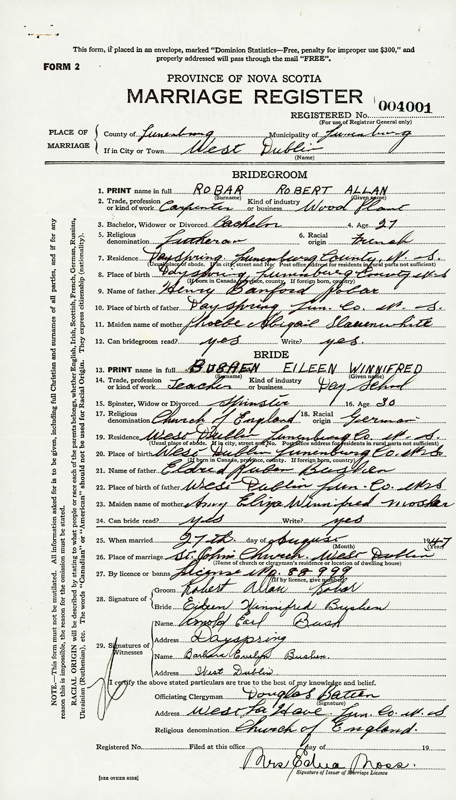PLACE OF MARRIAGE County of Lunenburg in City or Town West Dublin