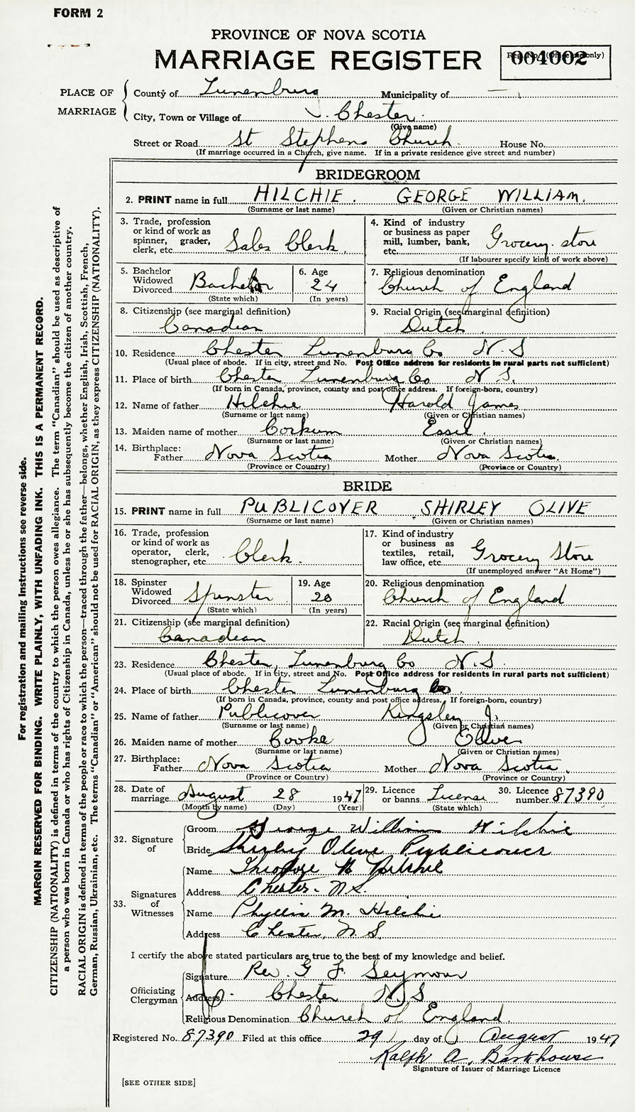 28. Date of marriage August 28 1947 29. By license or banns License 30. License number 87390