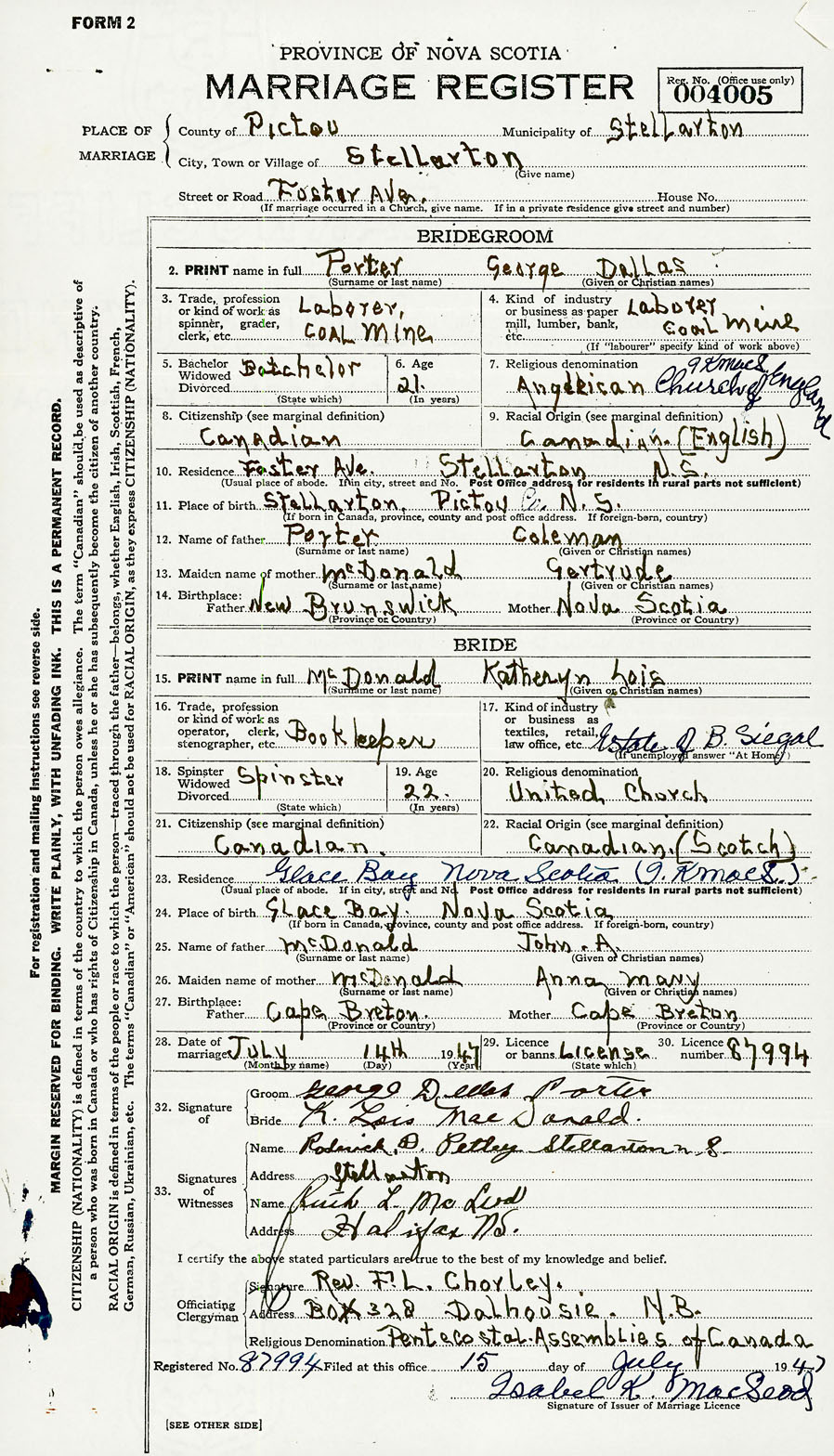 11. Place of birth Stellarton, Pictou County, Nova Scotia