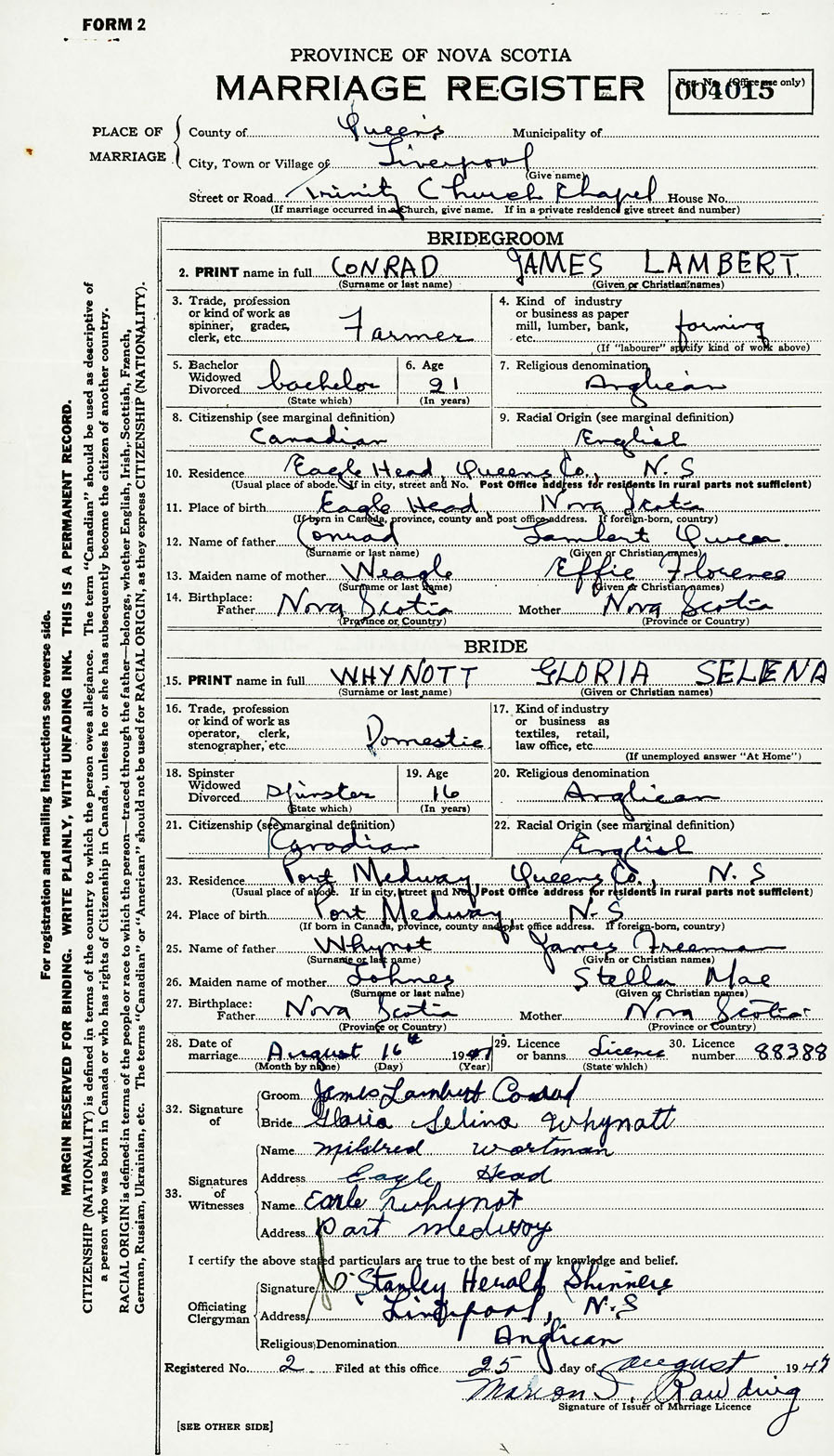 28. Date of marriage August 16 1947 29. By license or banns License 30. License number 88388