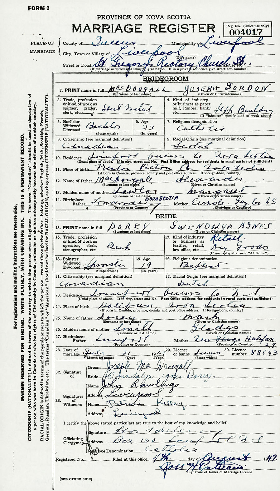 28. Date of marriage July 21 1947 29. By license or banns License 30. License number 88543