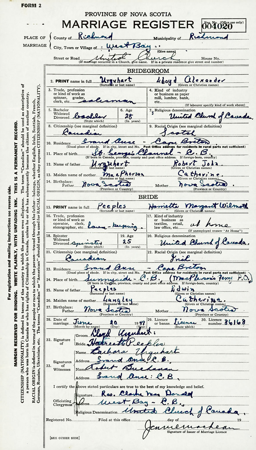 28. Date of marriage June 20 1947 29. By license or banns License 30. License number 86168