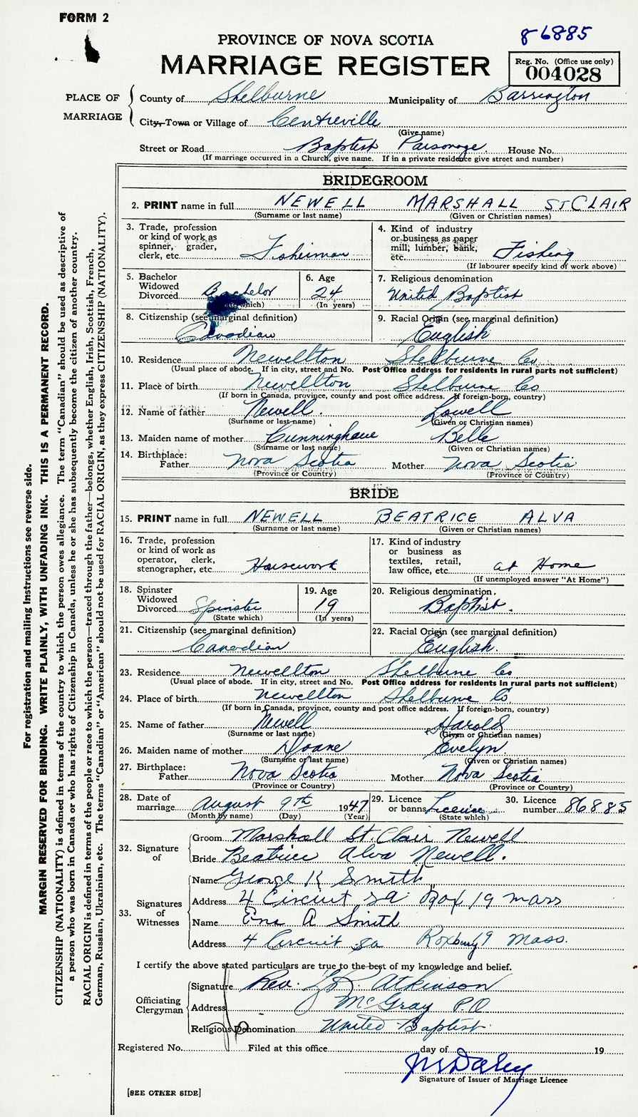 24. Place of birth Newellton, Shelburne County, Nova Scotia