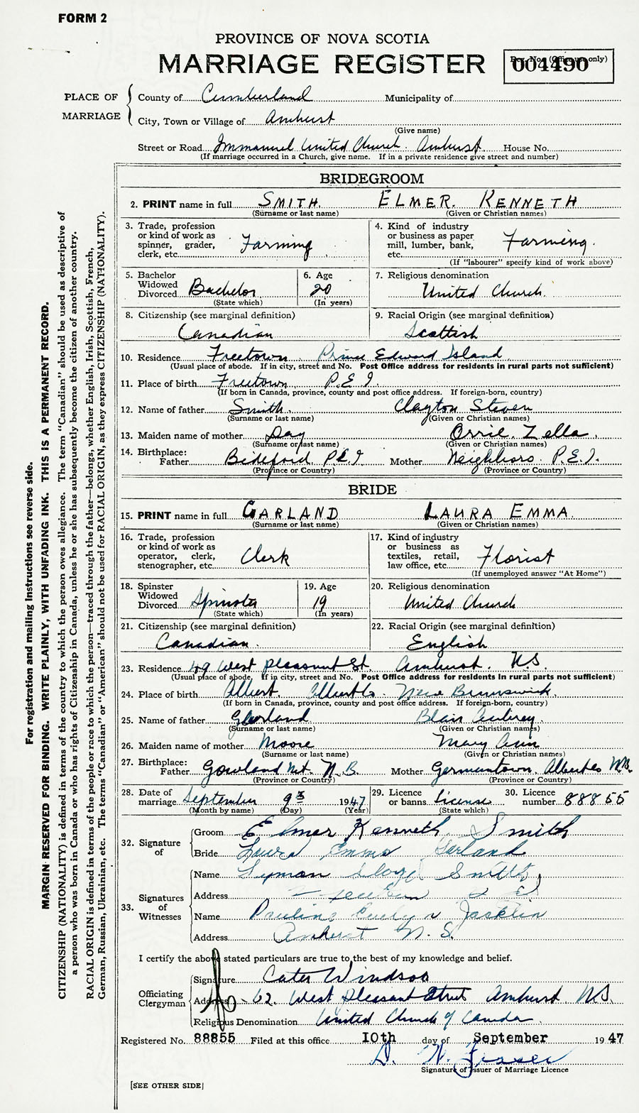28. Date of marriage September 9 1947 29. By license or banns License 30. License number 88855