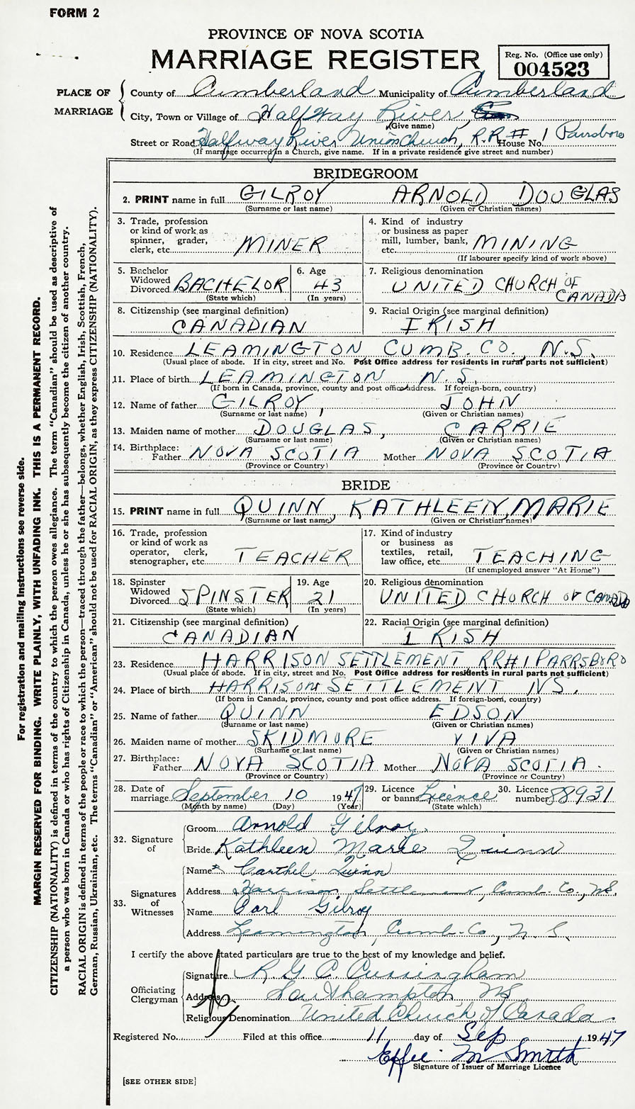 28. Date of marriage September 10 1947 29. By license or banns License 30. License number 88931