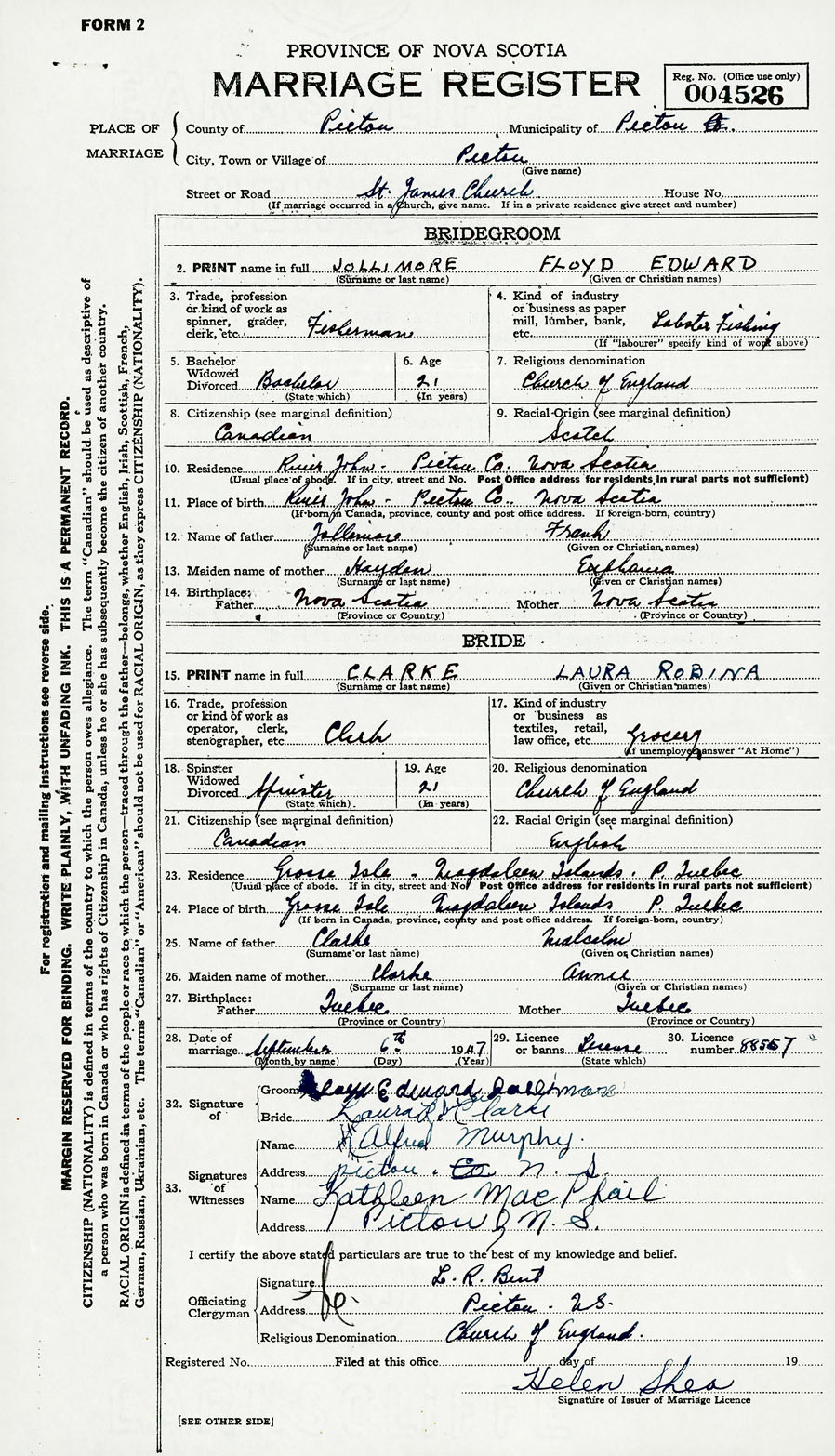 28. Date of marriage September 6 1947 29. By license or banns License 30. License number 88557