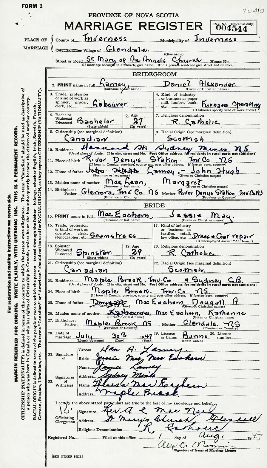 28. Date of marriage July 30 1947 29. By license or banns License 30. License number