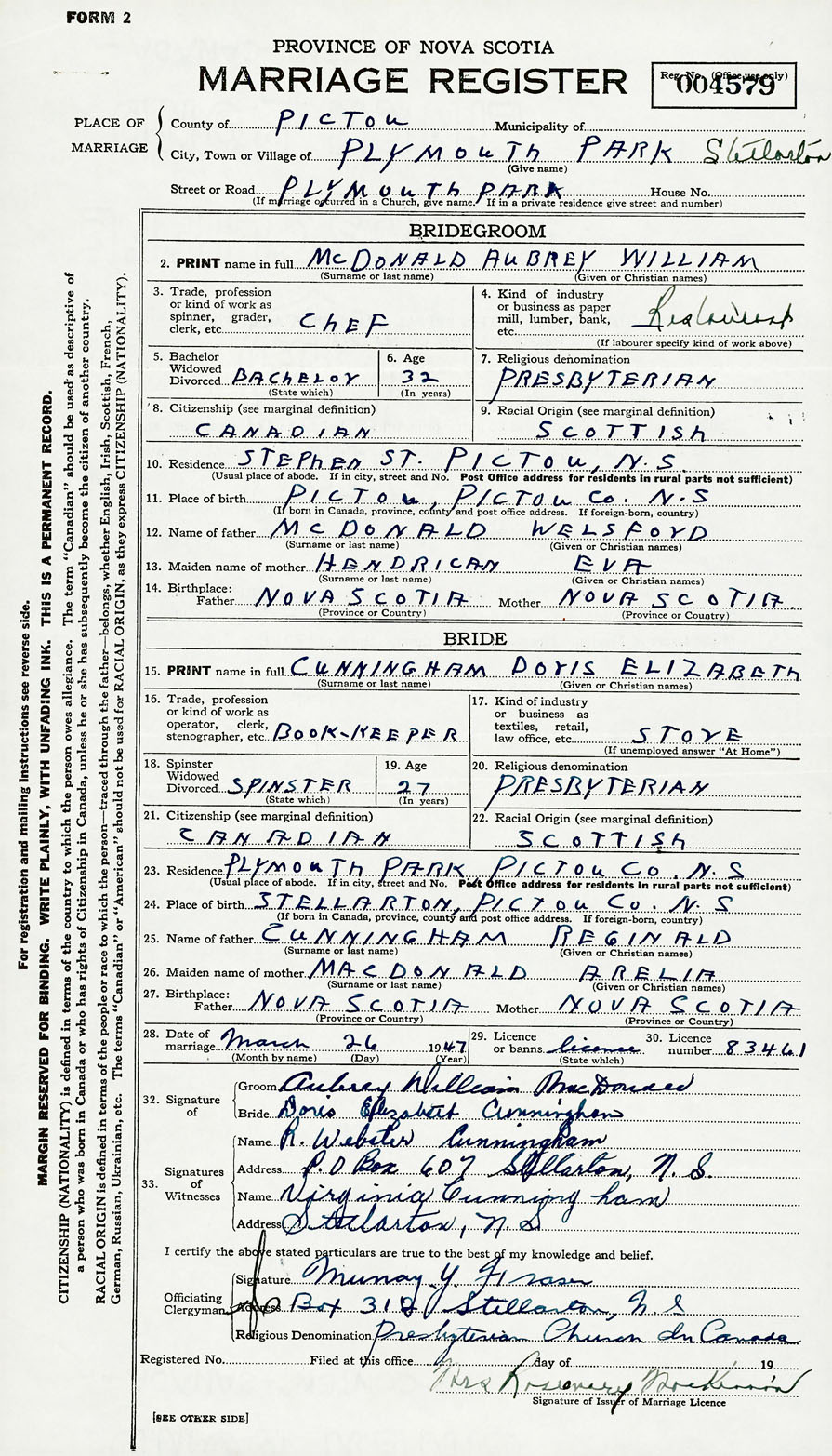 28. Date of marriage March 26 1947 29. By license or banns License 30. License number 83461