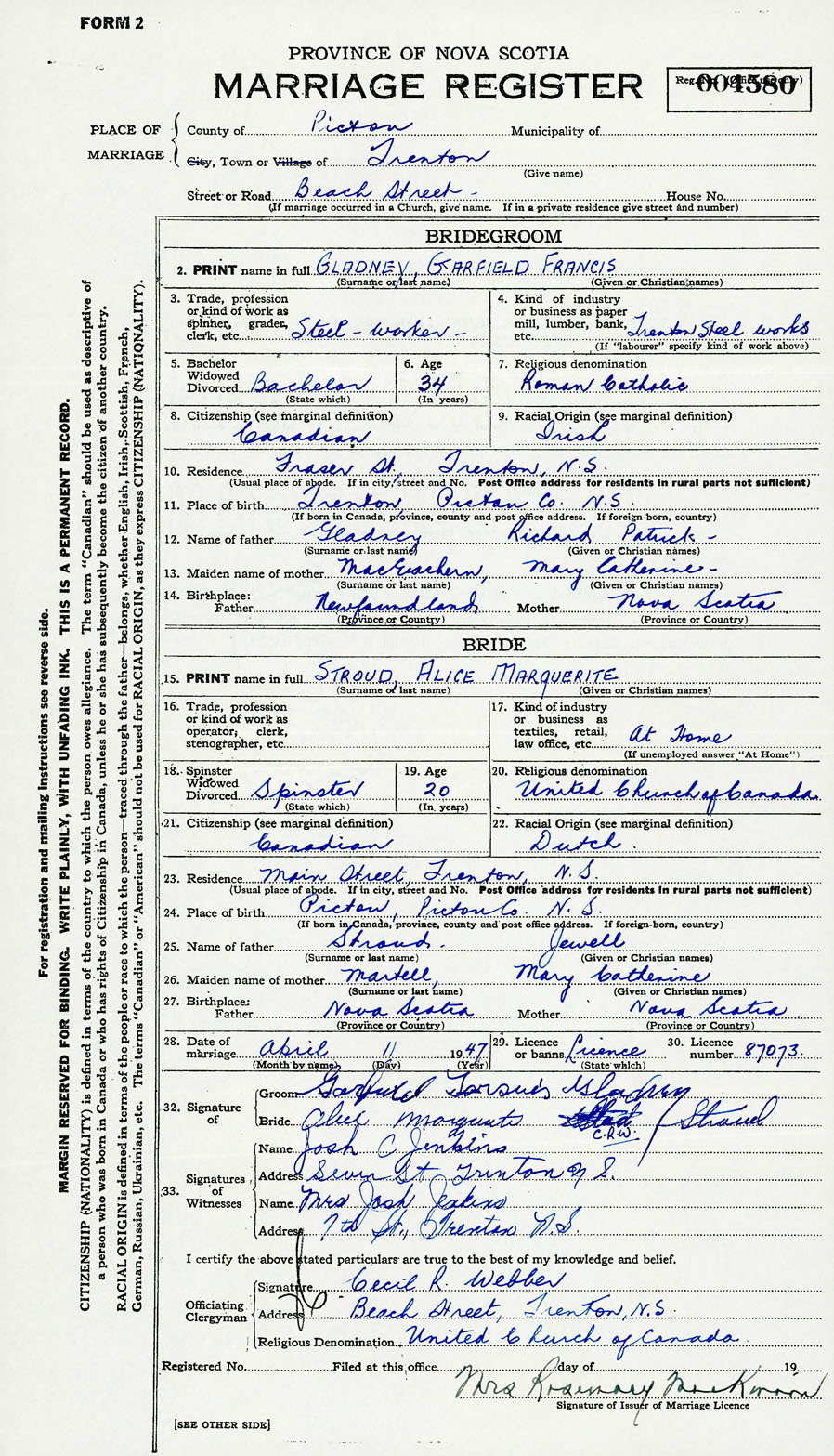 28. Date of marriage April 11 1947 29. By license or banns License 30. License number 87073