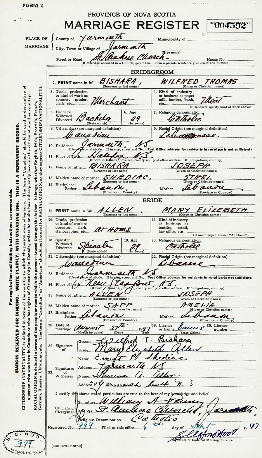 Groom Wilfred Thomas Bishara