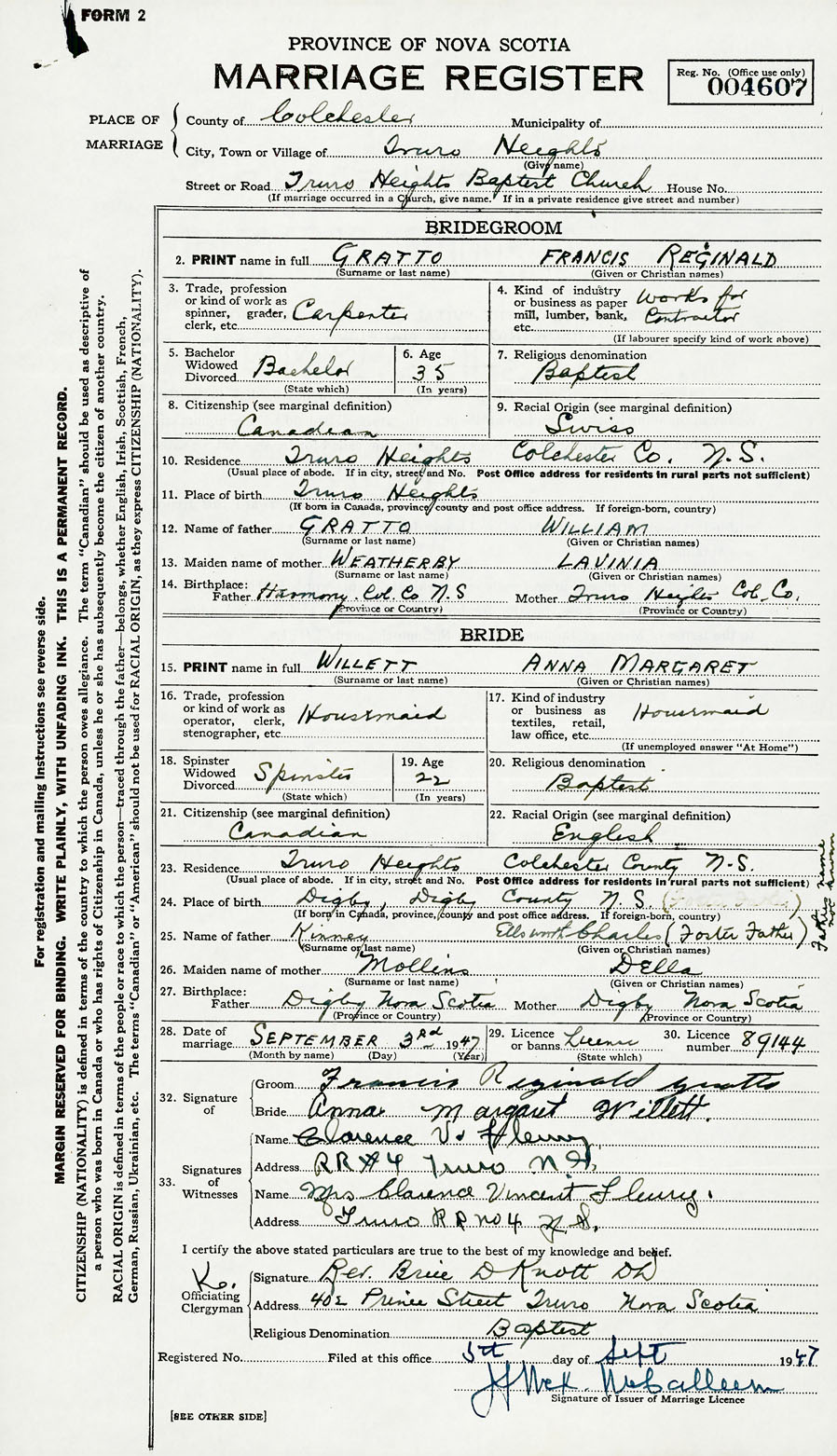 28. Date of marriage September 3 1947 29. By license or banns License 30. License number 89144
