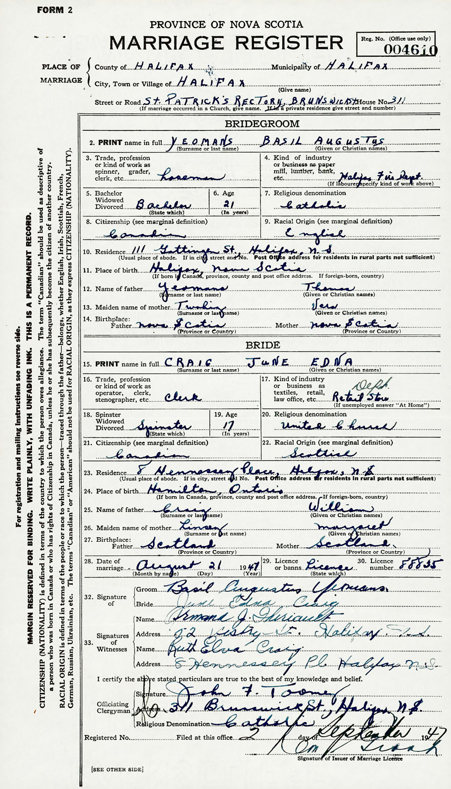 28. Date of marriage August 21 1947 29. By license or banns License 30. License number 88835