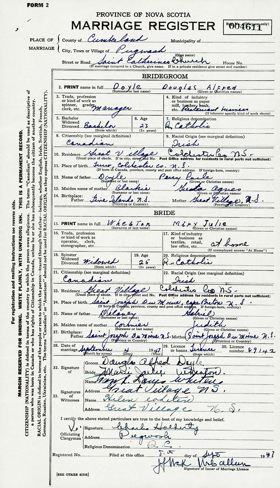 28. Date of marriage September 4 1947 29. By license or banns License 30. License number 89142