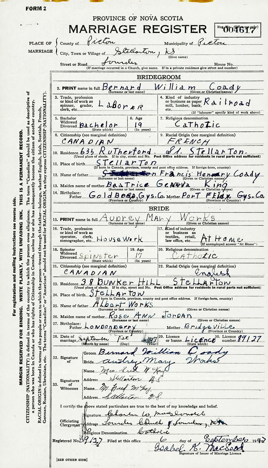 28. Date of marriage September 1 1947 29. By license or banns License 30. License number 89127