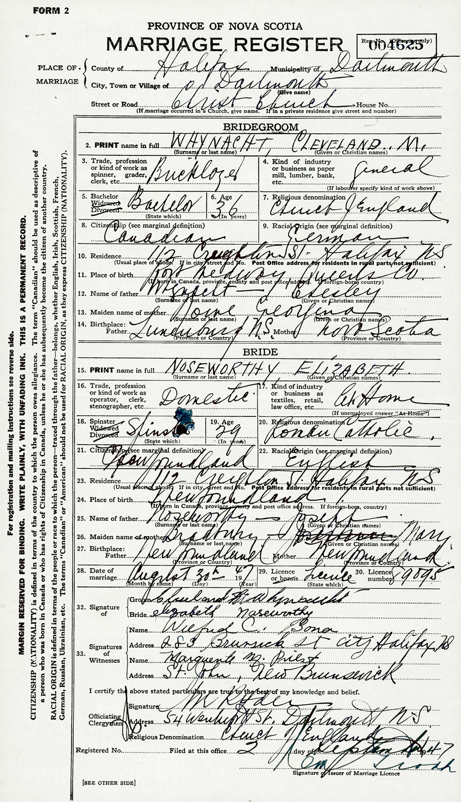 28. Date of marriage August 30 1947 29. By license or banns License 30. License number 89095
