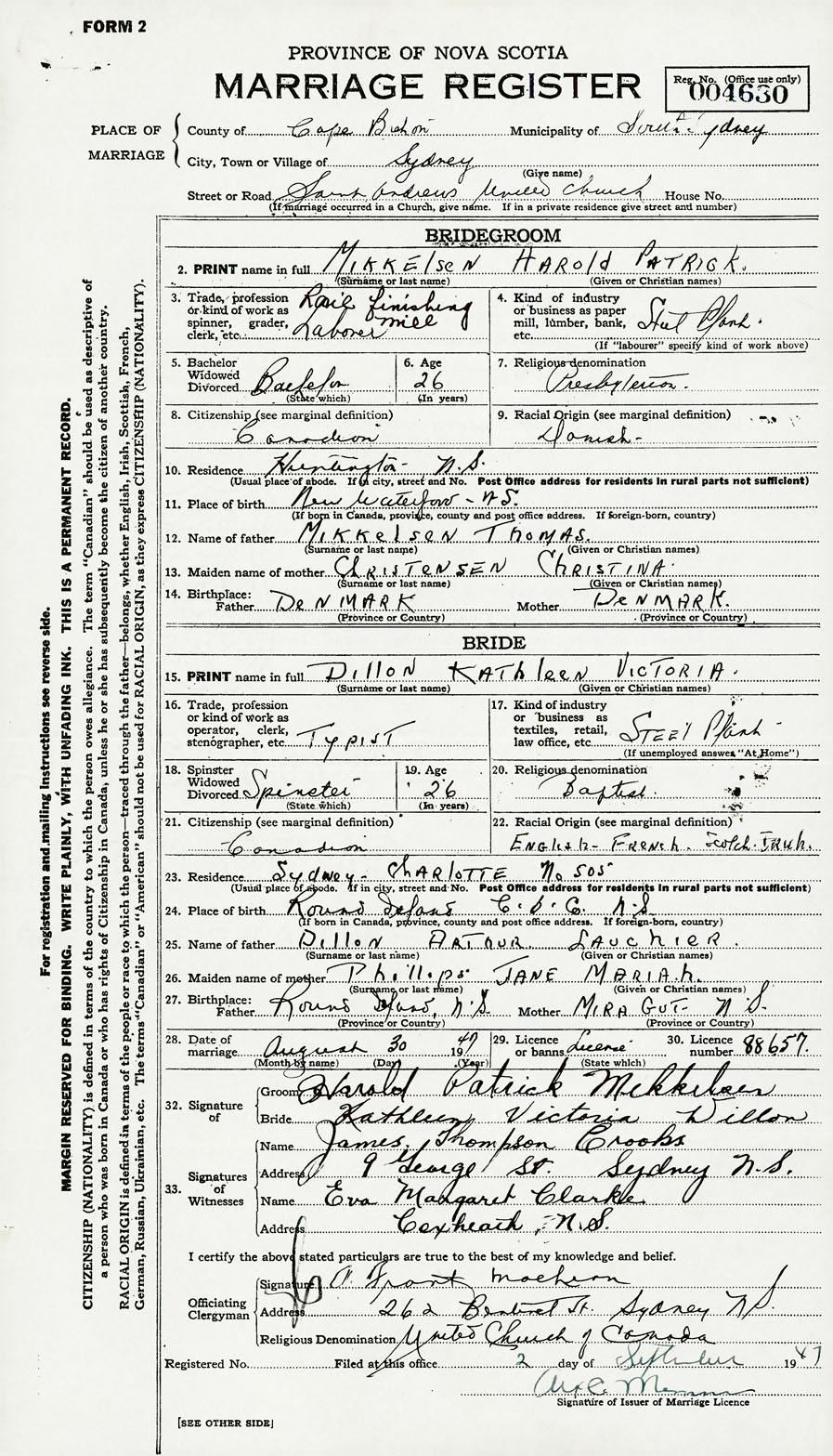 28. Date of marriage August 30 1947 29. By license or banns License 30. License number 88657