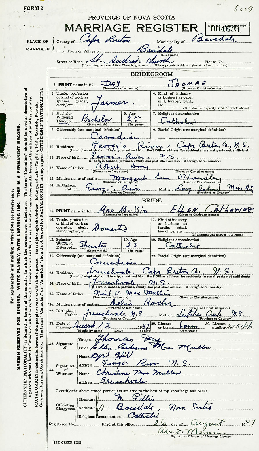 28. Date of marriage August 12 1947 29. By license or banns License 30. License number