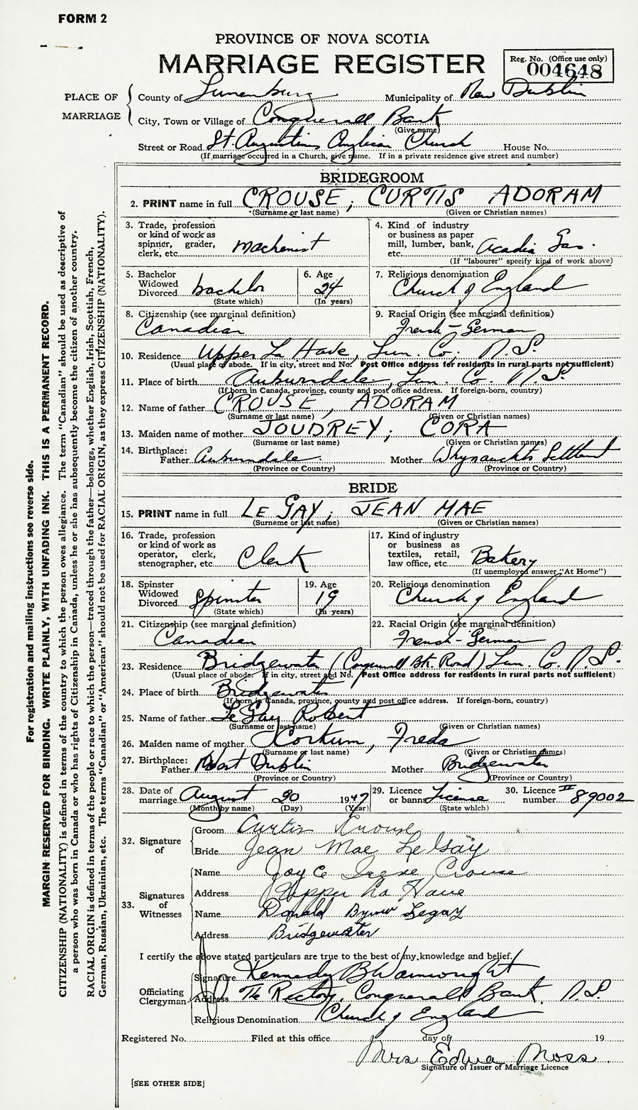 28. Date of marriage August 20 1947 29. By license or banns License 30. License number 89002