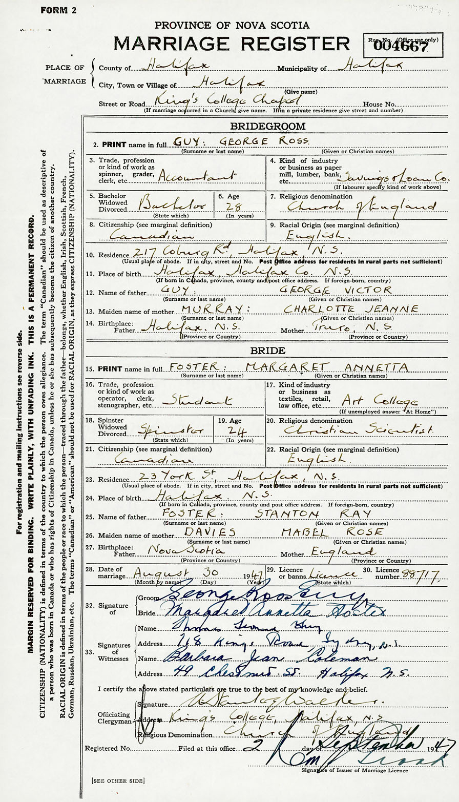 28. Date of marriage August 30 1947 29. By license or banns License 30. License number 88717