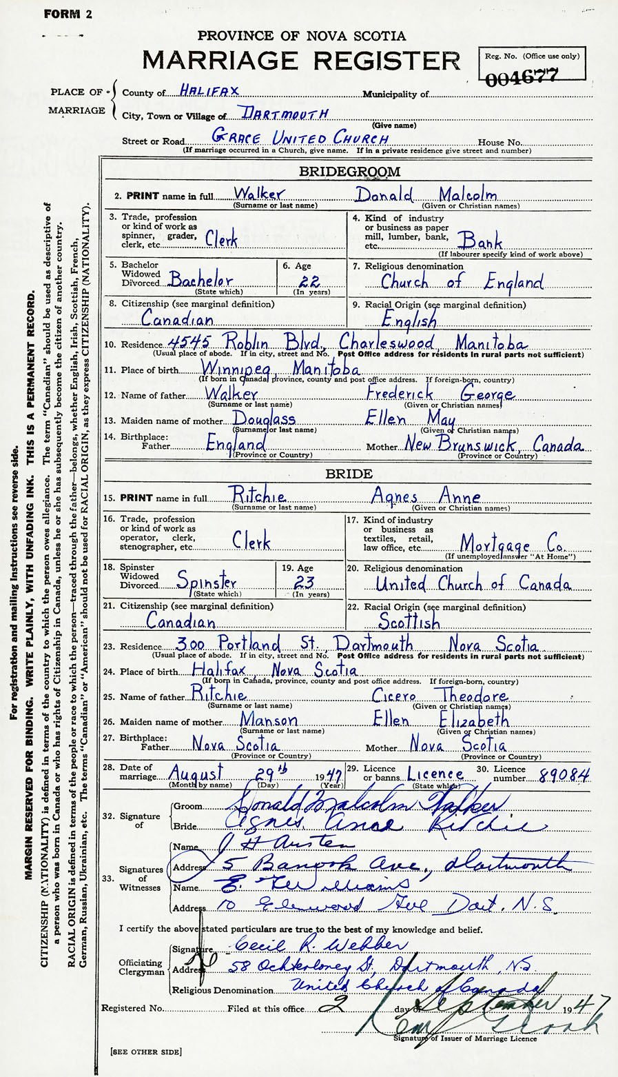 28. Date of marriage August 29 1947 29. By license or banns License 30. License number 89084