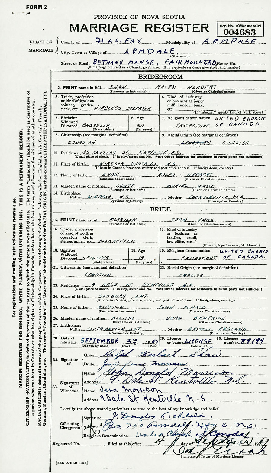 28. Date of marriage September 3 1947 29. By license or banns License 30. License number 89199