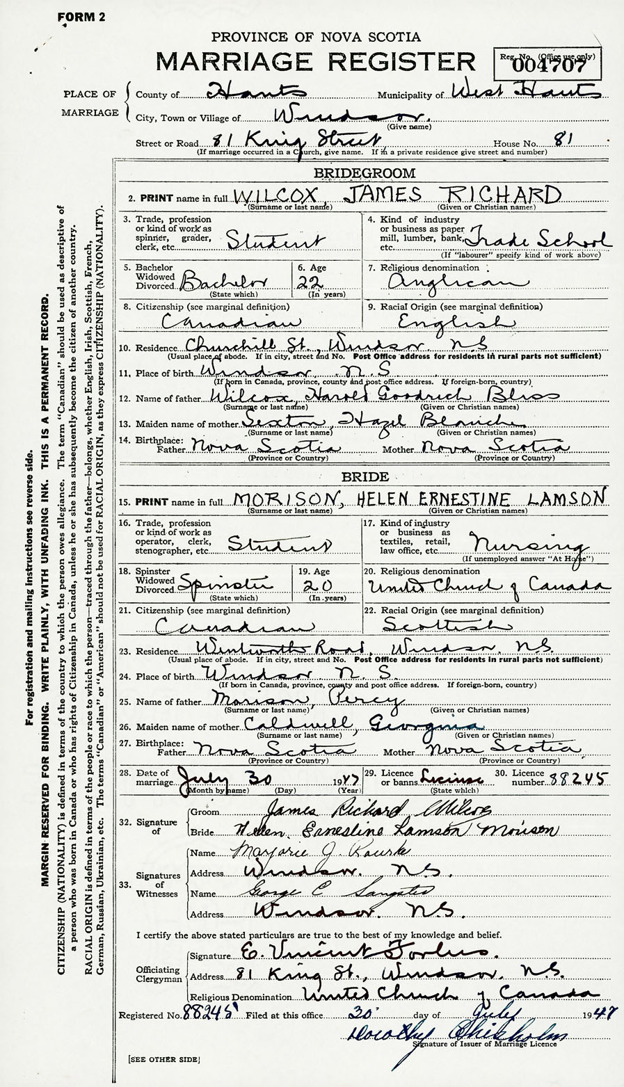 28. Date of marriage July 30 1947 29. By license or banns License 30. License number 88245