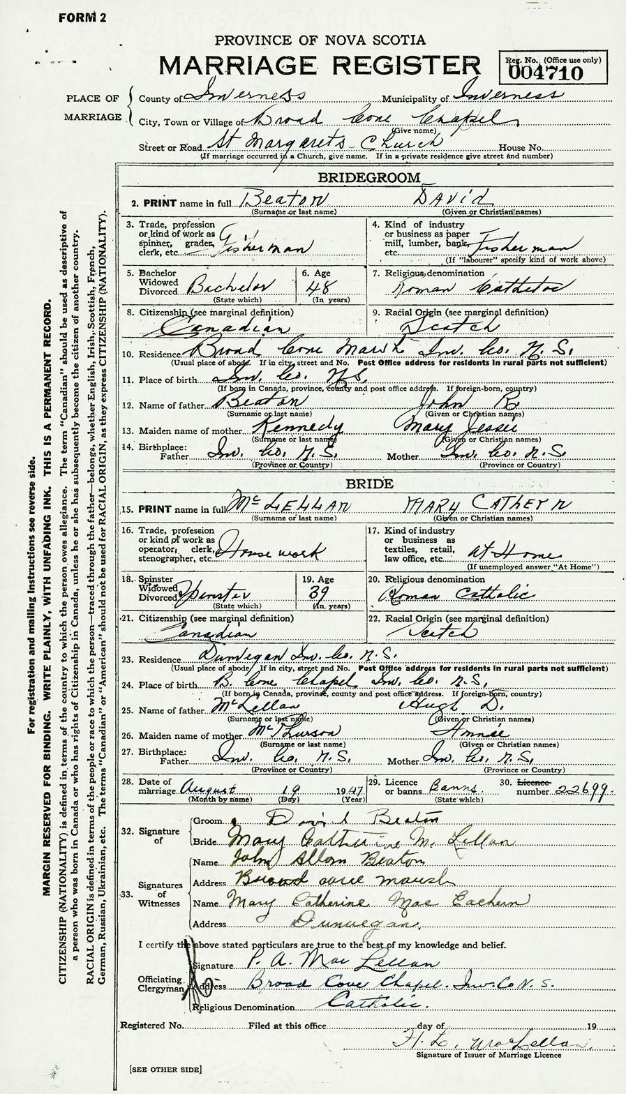 28. Date of marriage August 19 1947 29. By license or banns License 30. License number