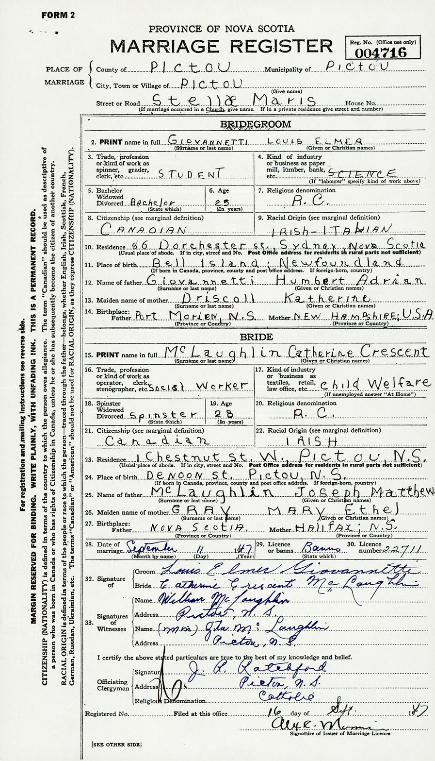 28. Date of marriage September 11 1947 29. By license or banns License 30. License number