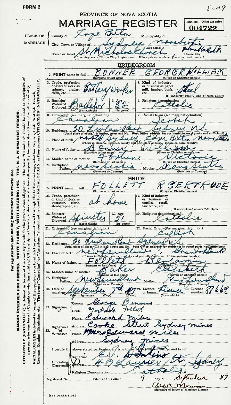 28. Date of marriage September 7 1947 29. By license or banns License 30. License number 88663