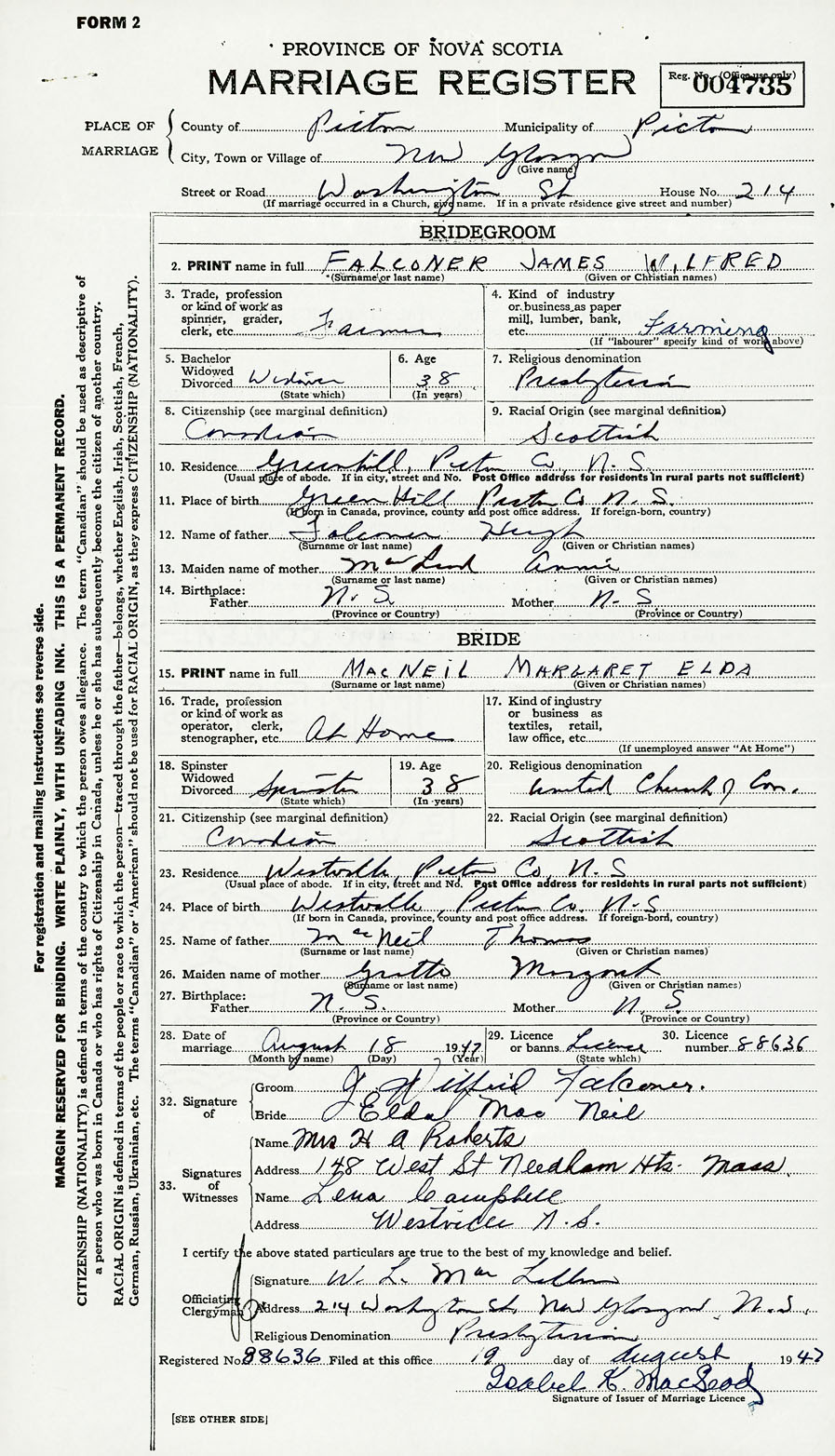 28. Date of marriage August 18 1947 29. By license or banns License 30. License number 88636