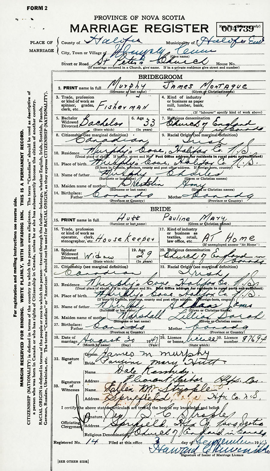 24. Place of birth Murphy’s Cove, Halifax County, Nova Scotia
