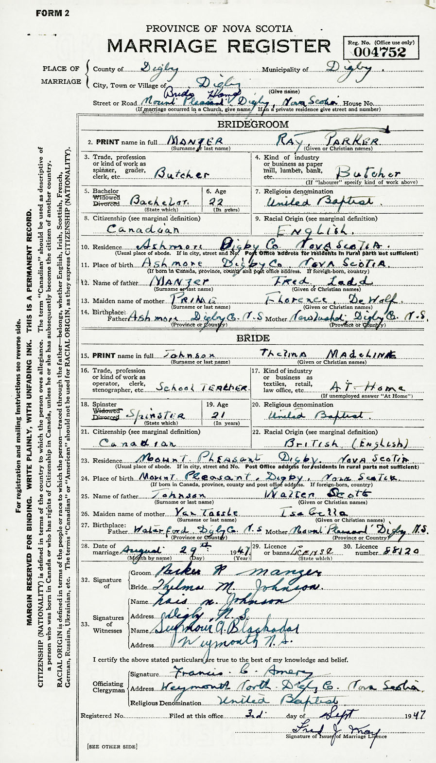 28. Date of marriage August 29 1947 29. By license or banns License 30. License number 88120