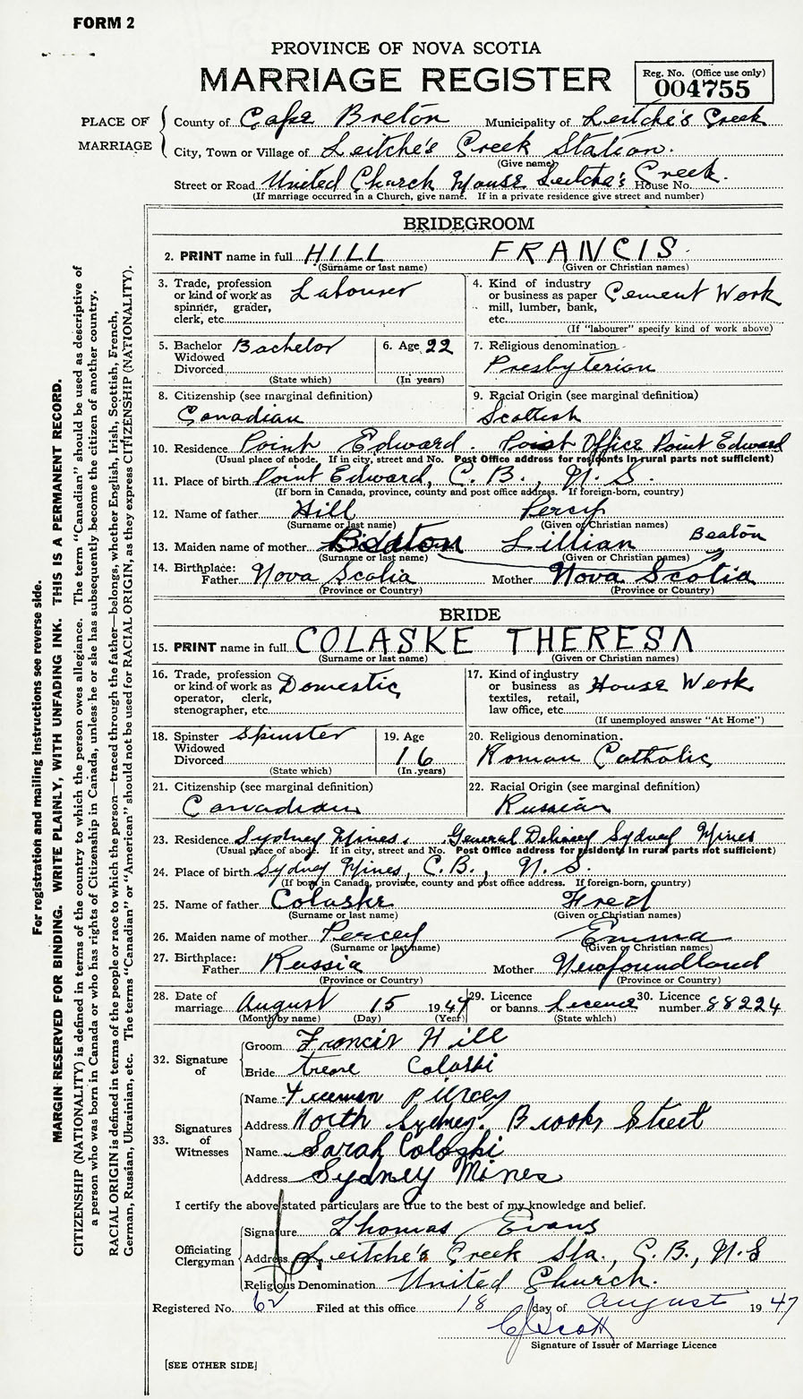 28. Date of marriage August 15 1947 29. By license or banns License 30. License number 88224