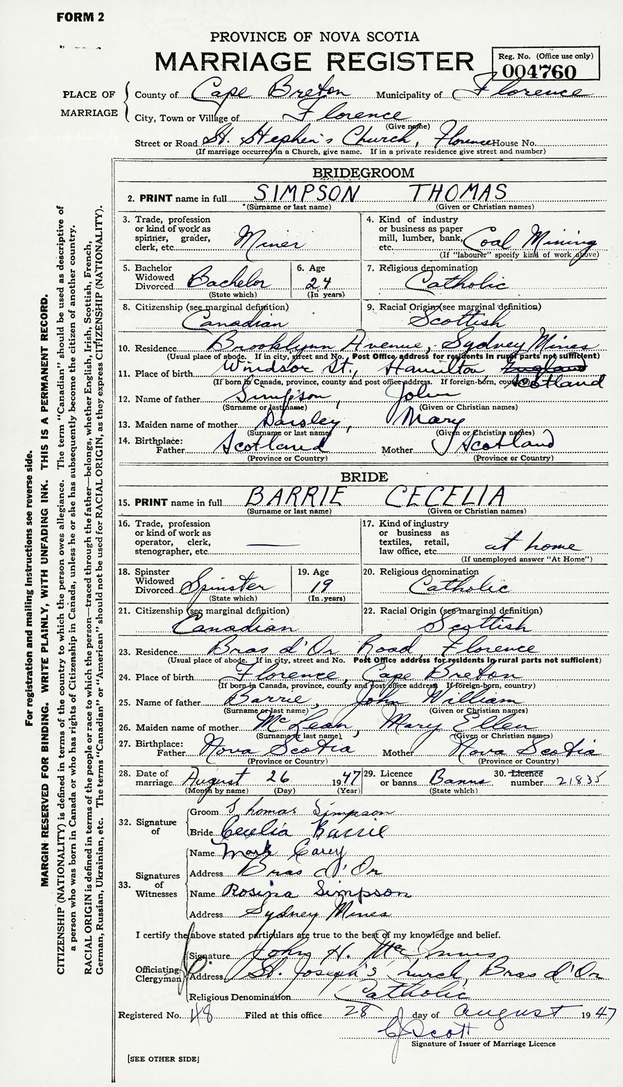 28. Date of marriage August 26 1947 29. By license or banns License 30. License number